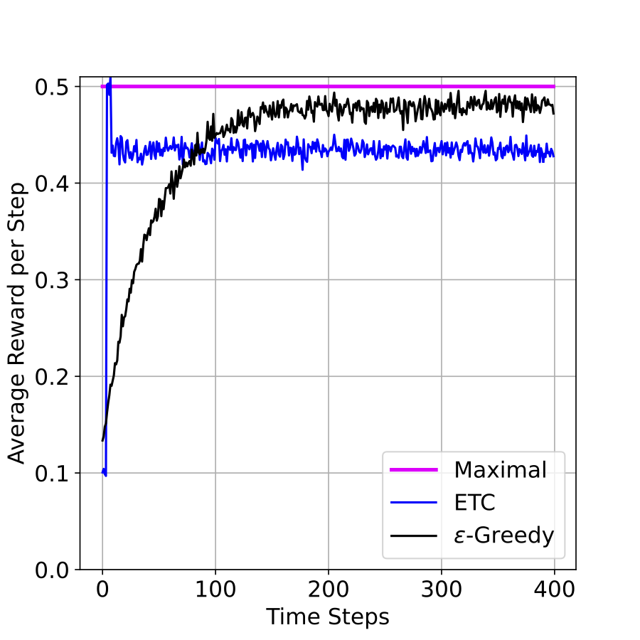 រូបទី២៖ រង្វាន់មធ្យមក្នុងមួយជំហាន ដែលប្រមាណវិធីនិមួយៗទទួលបានក្នុងបញ្ហា $2$-armed bandit ដែល $\mu_1=0.1$ និង $\mu_2=0.5$។ អ័ក្សឈរបង្ហាញពីរង្វាន់មធ្យមក្នុងមួយជំហាននៃប្រមាណវិធីនិមួយៗ ឯអ័ក្សដេកបង្ហាញពីចំនួនជំហានដែលបានលេងហើយ។